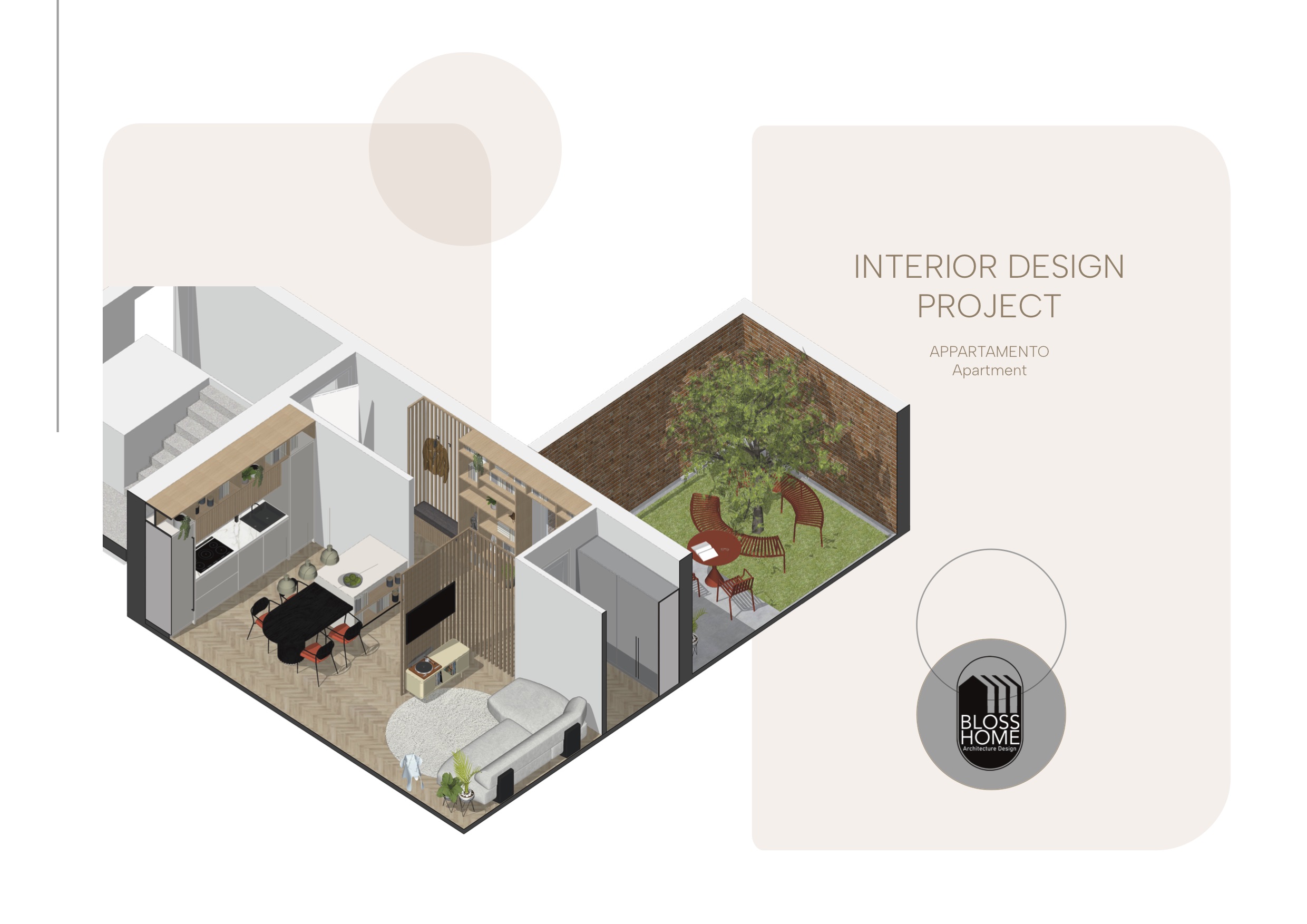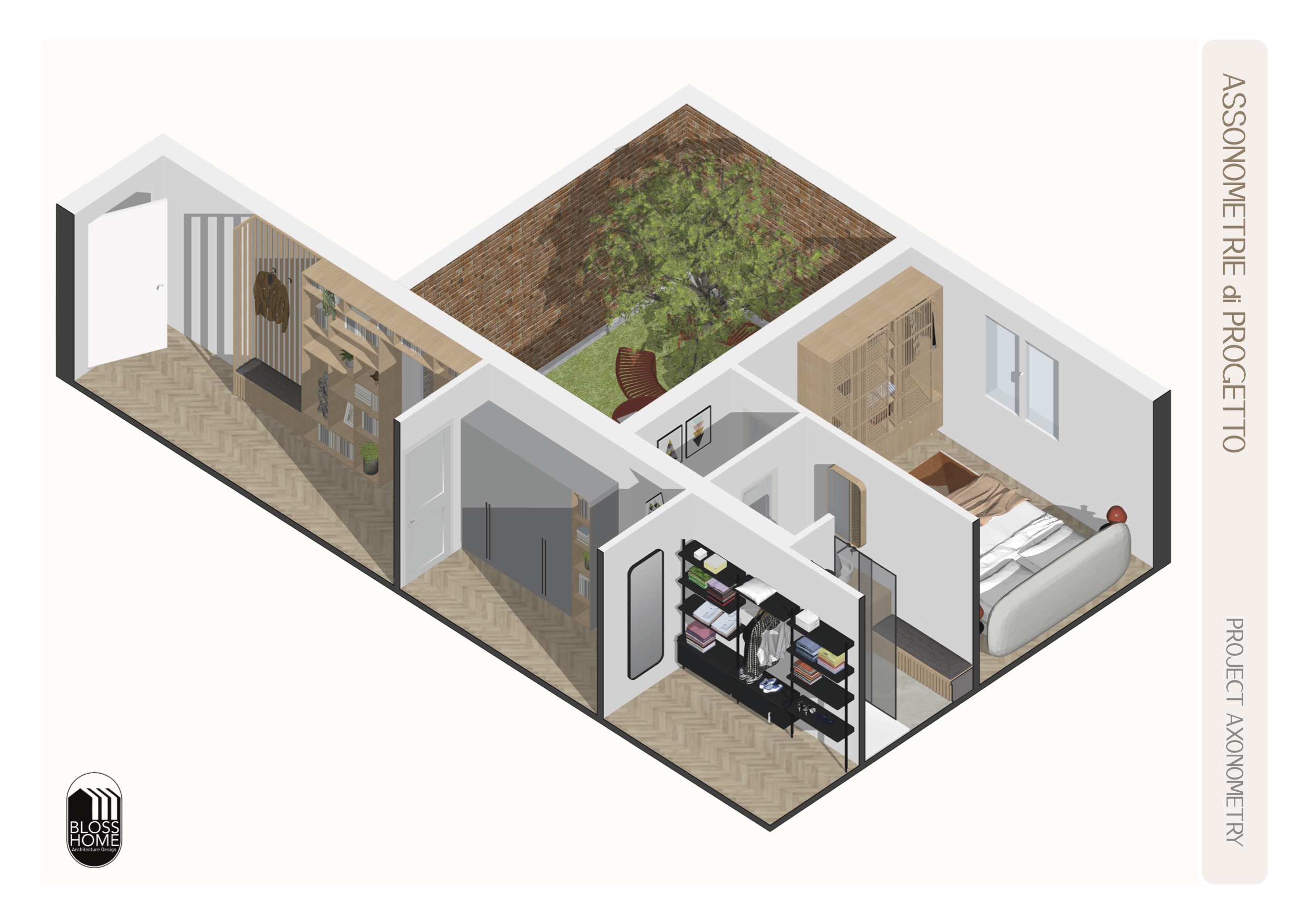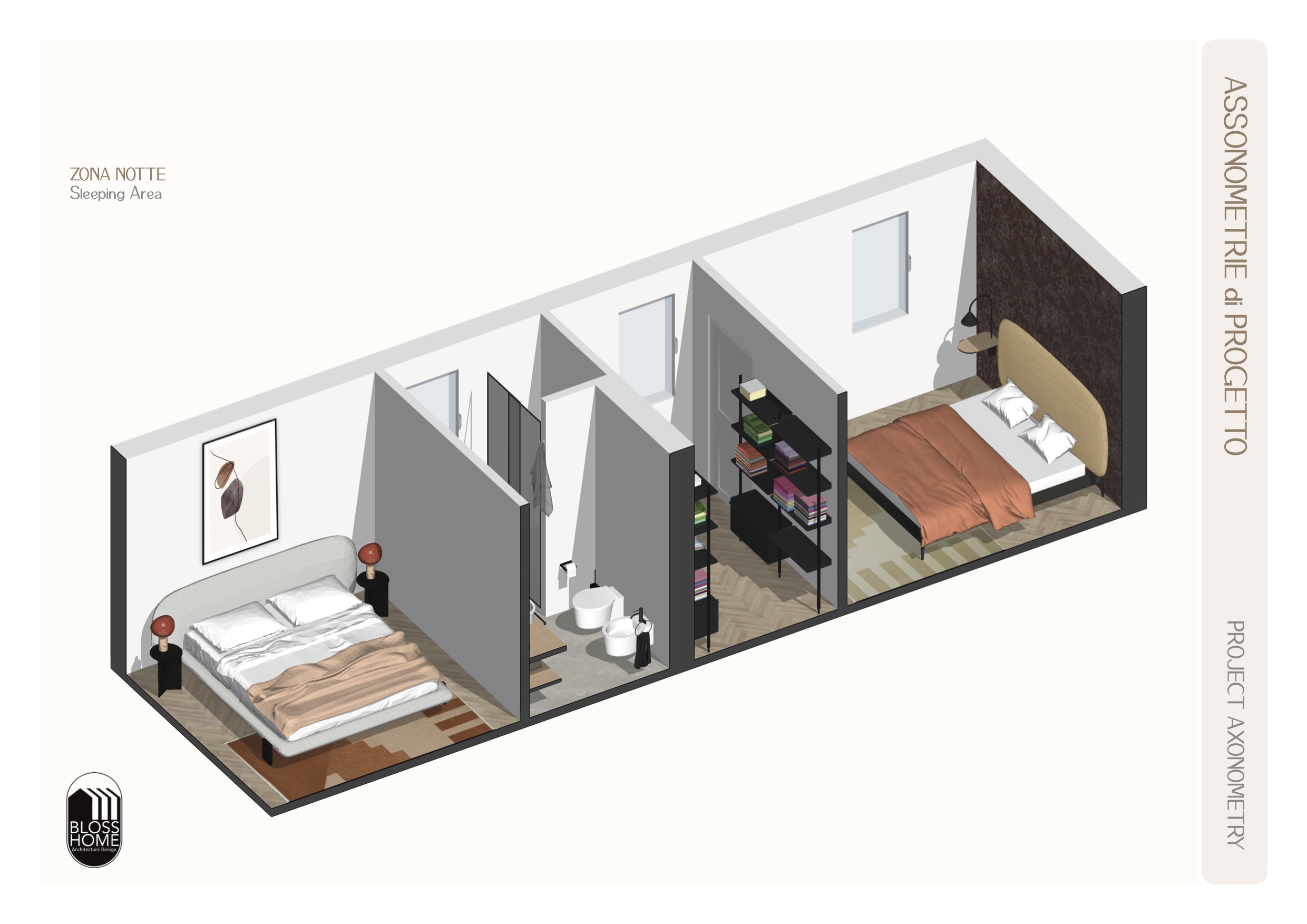 L’appartamento presenta una zona giorno aperta in cui, tramite l’utilizzo di una parete divisoria listellata permeabile e di una penisola lo spazio è stato volutamente separato, mantenendo ugualmente l’integrazione tra gli spazi. La zona notte è in questo caso composta da 2 camere, cabina armadio per la camera master e 1 bagno di pertinenza zona giorno e notte.