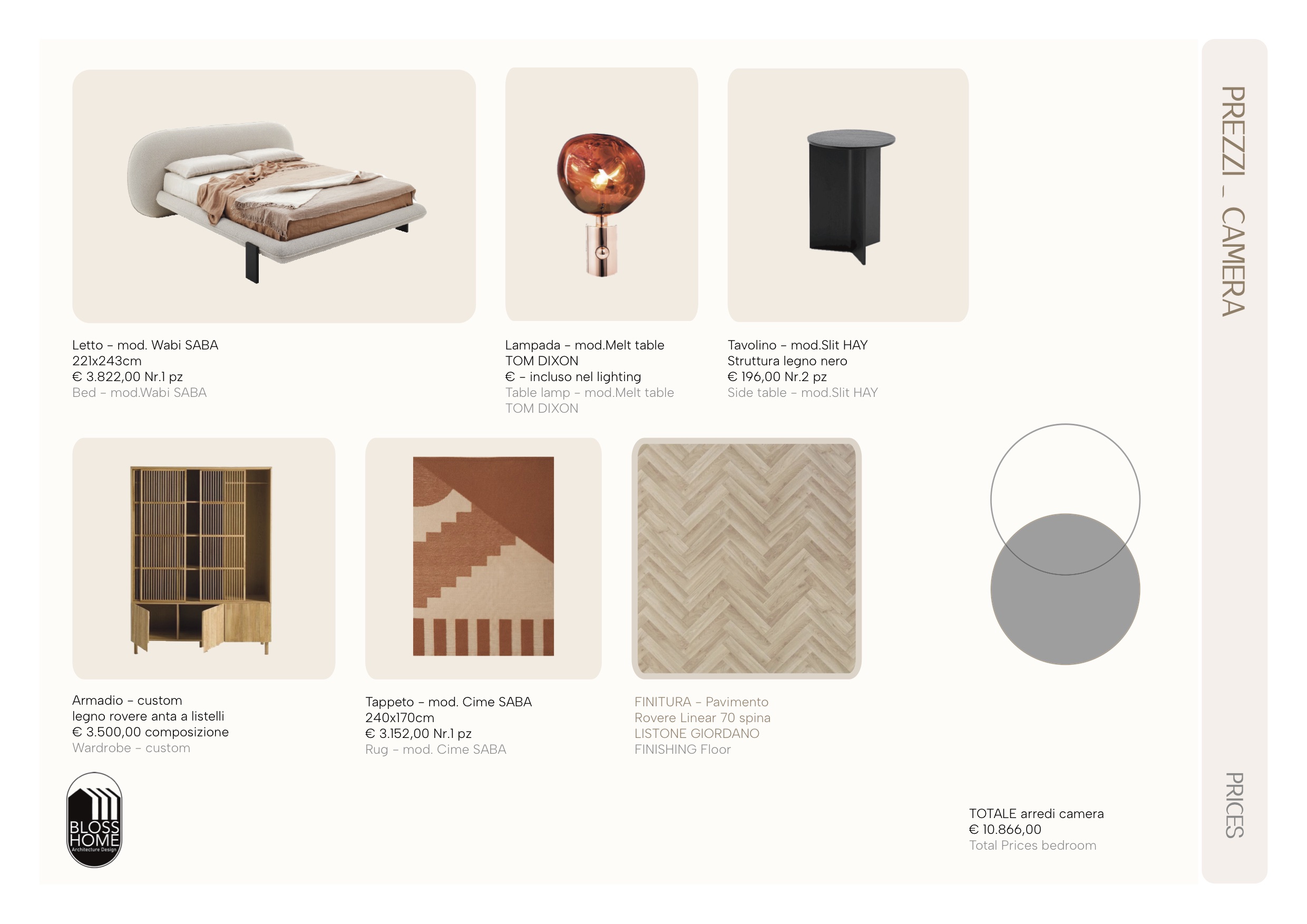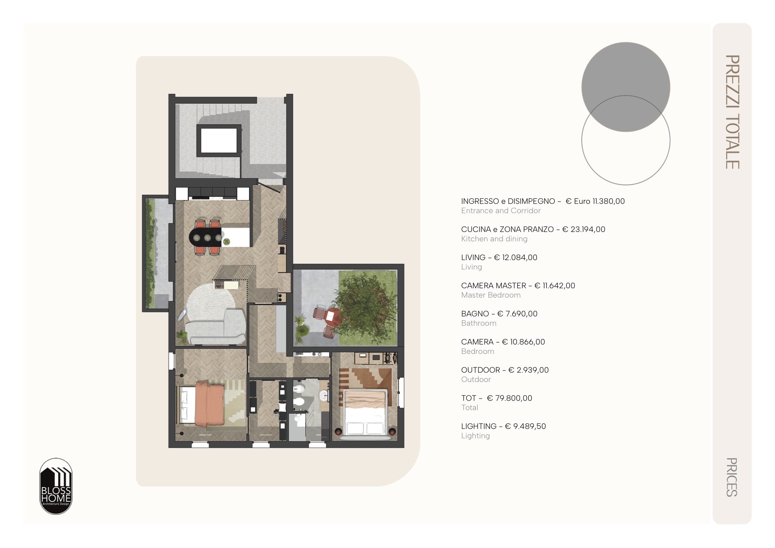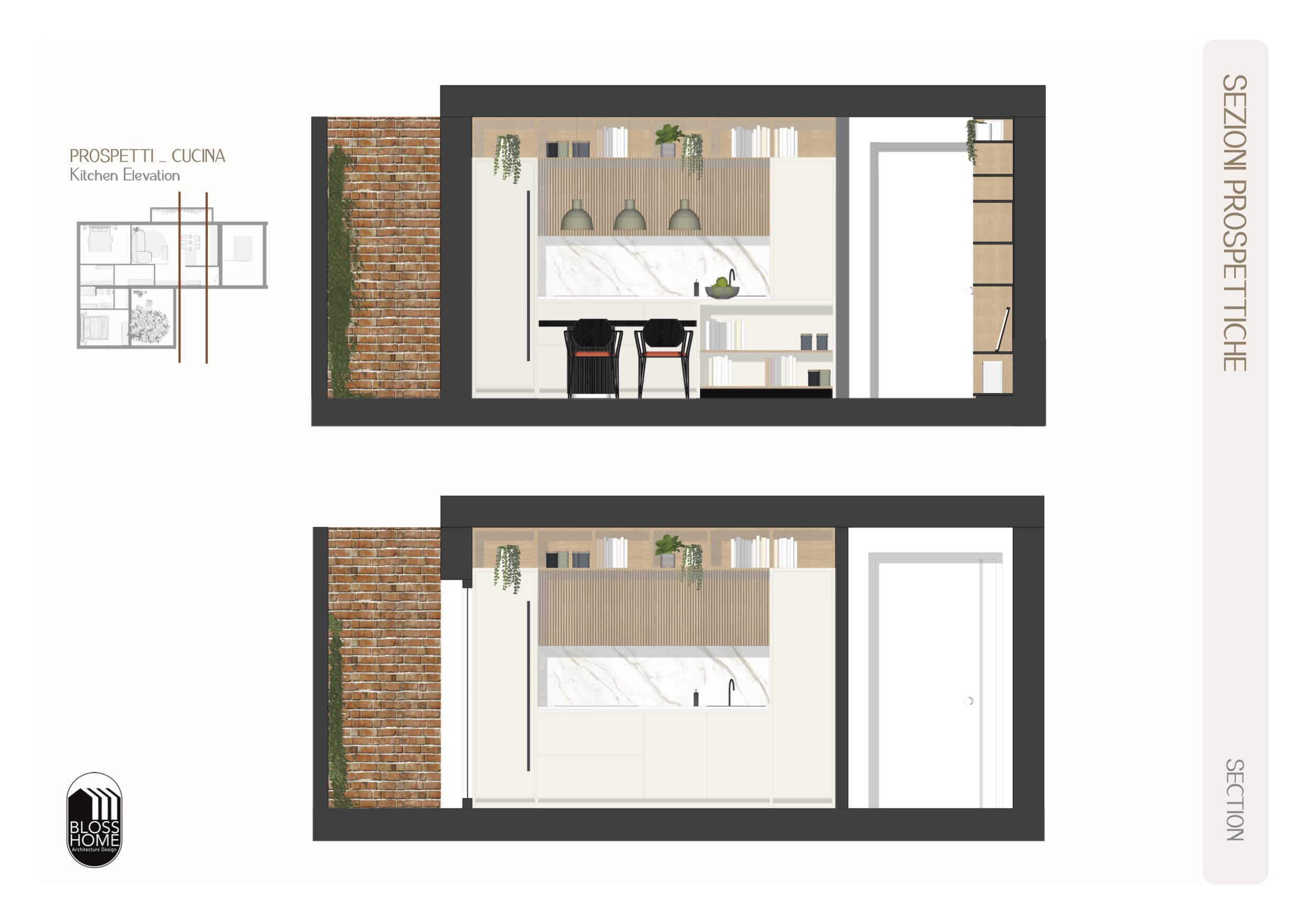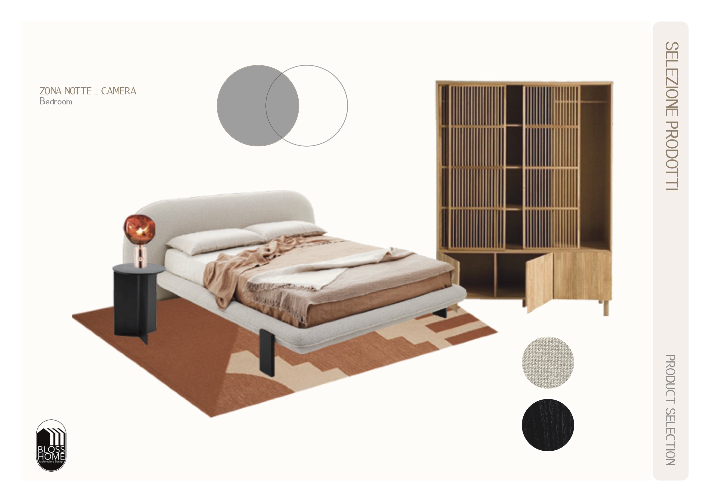 L’appartamento presenta una zona giorno aperta in cui, tramite l’utilizzo di una parete divisoria listellata permeabile e di una penisola lo spazio è stato volutamente separato, mantenendo ugualmente l’integrazione tra gli spazi. La zona notte è in questo caso composta da 2 camere, cabina armadio per la camera master e 1 bagno di pertinenza zona giorno e notte.