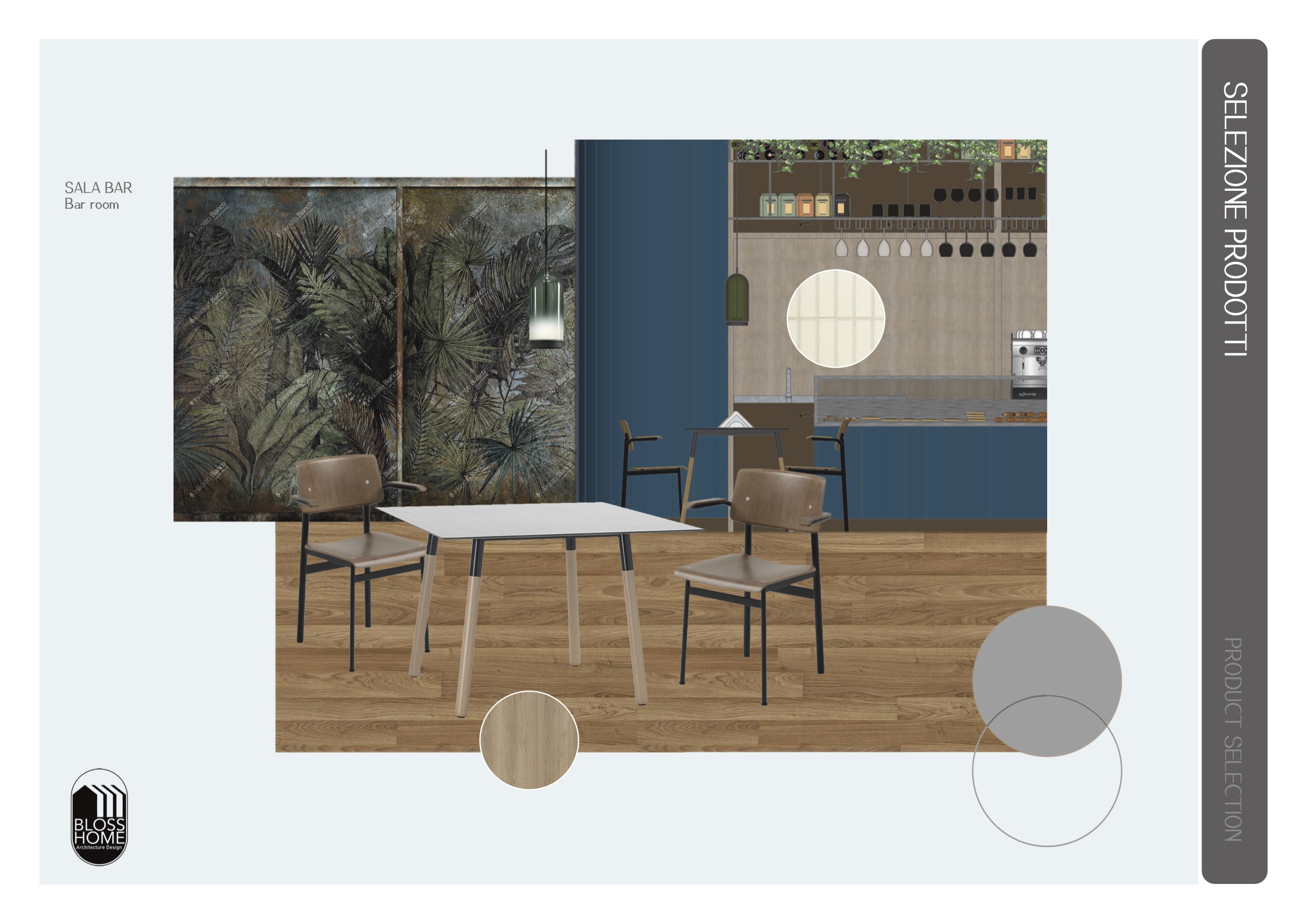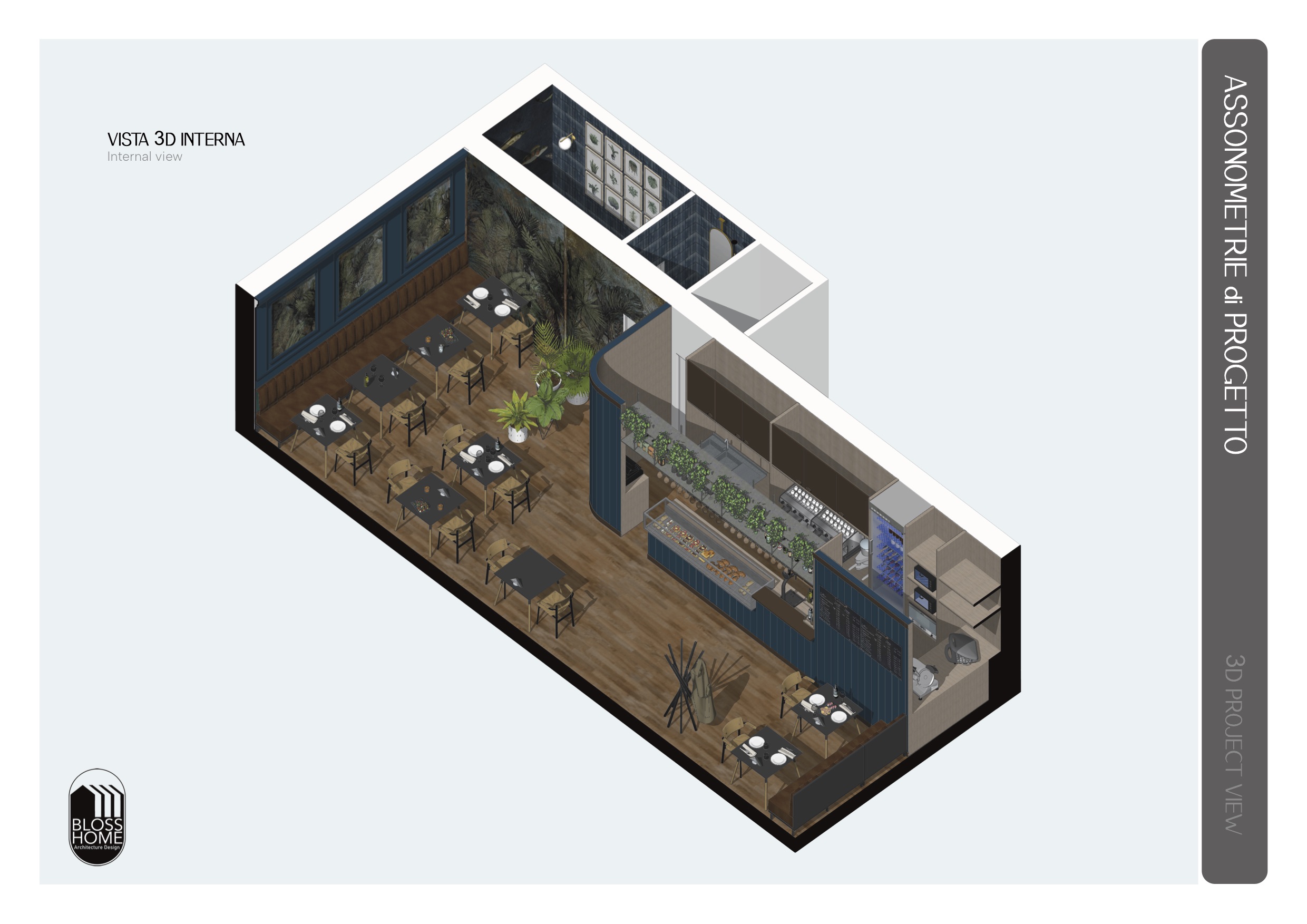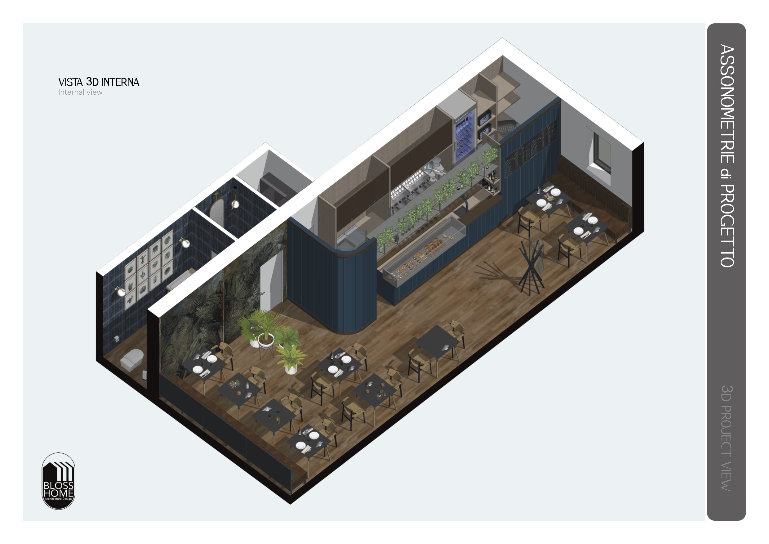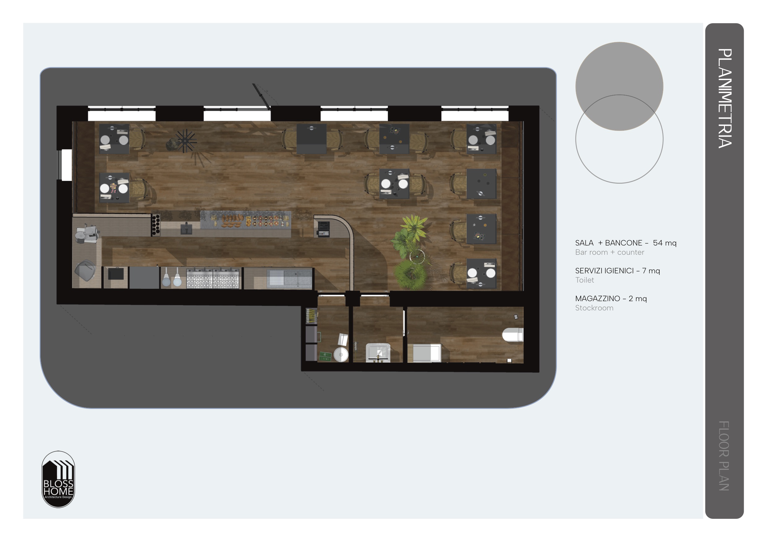 Il locale progettato è di circa 150mq e si sviluppa longitudinalmente. Il bancone attrezzato è collegato con l’area di preparazione, la sala con le sue diverse tipologie di seduta ed i materiali caldi, risulta conviviale ed avvolgente. I materiali selezionati richiamano i toni scuri per caratterizzare in stile simil inglese il locale.