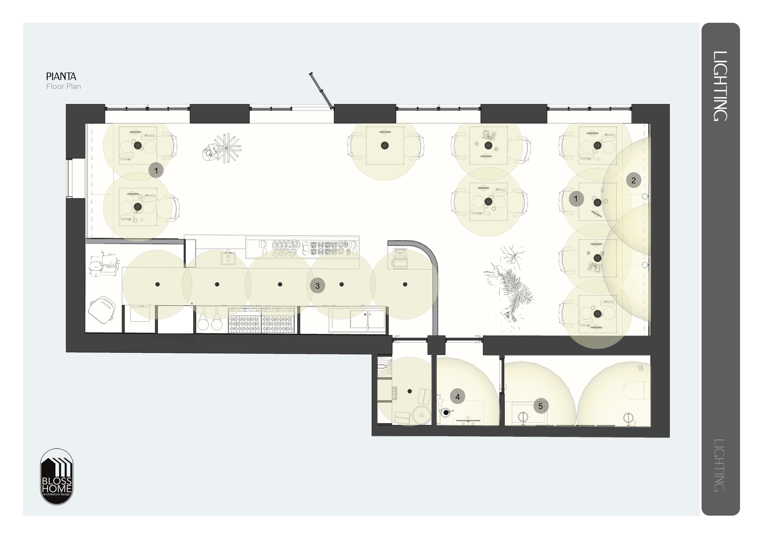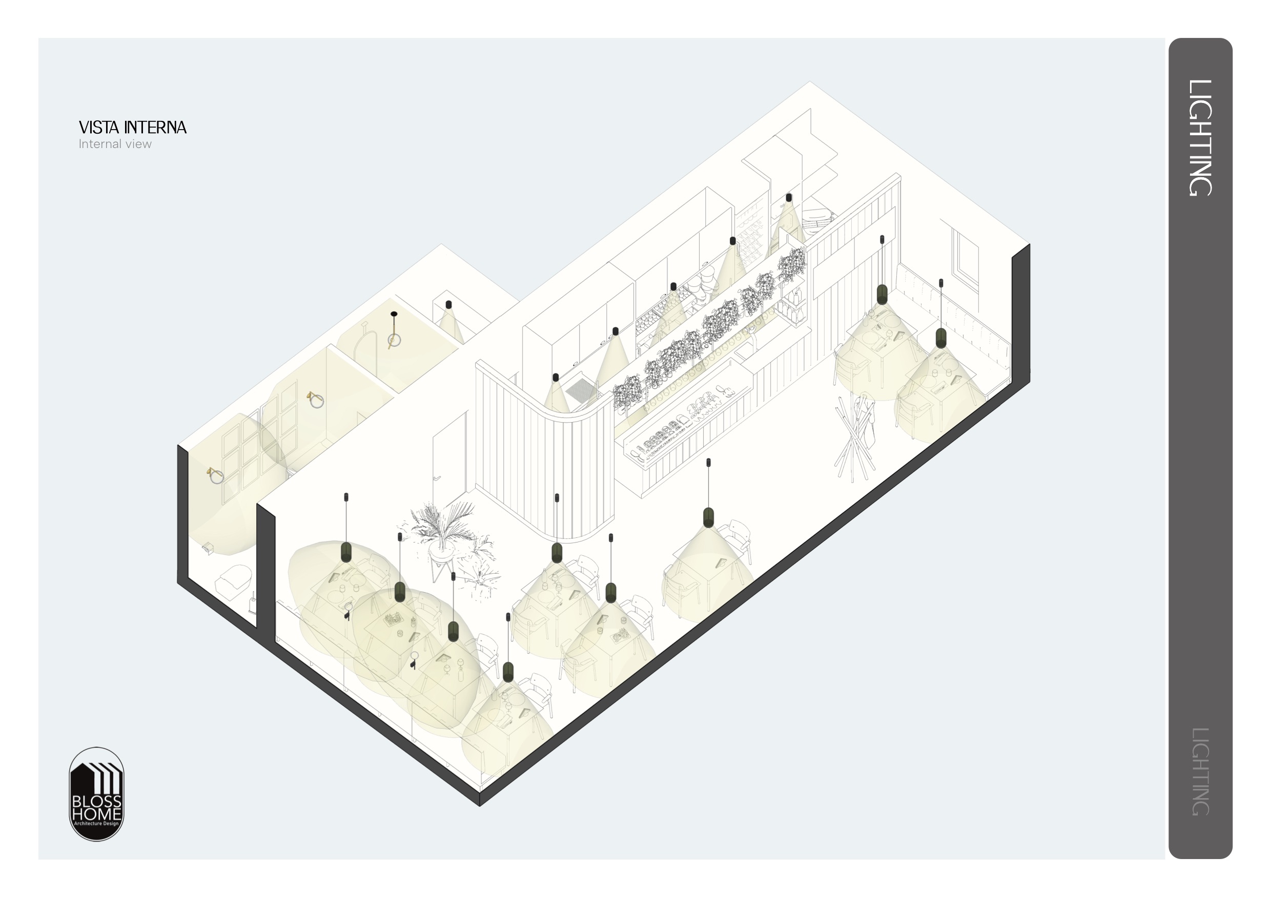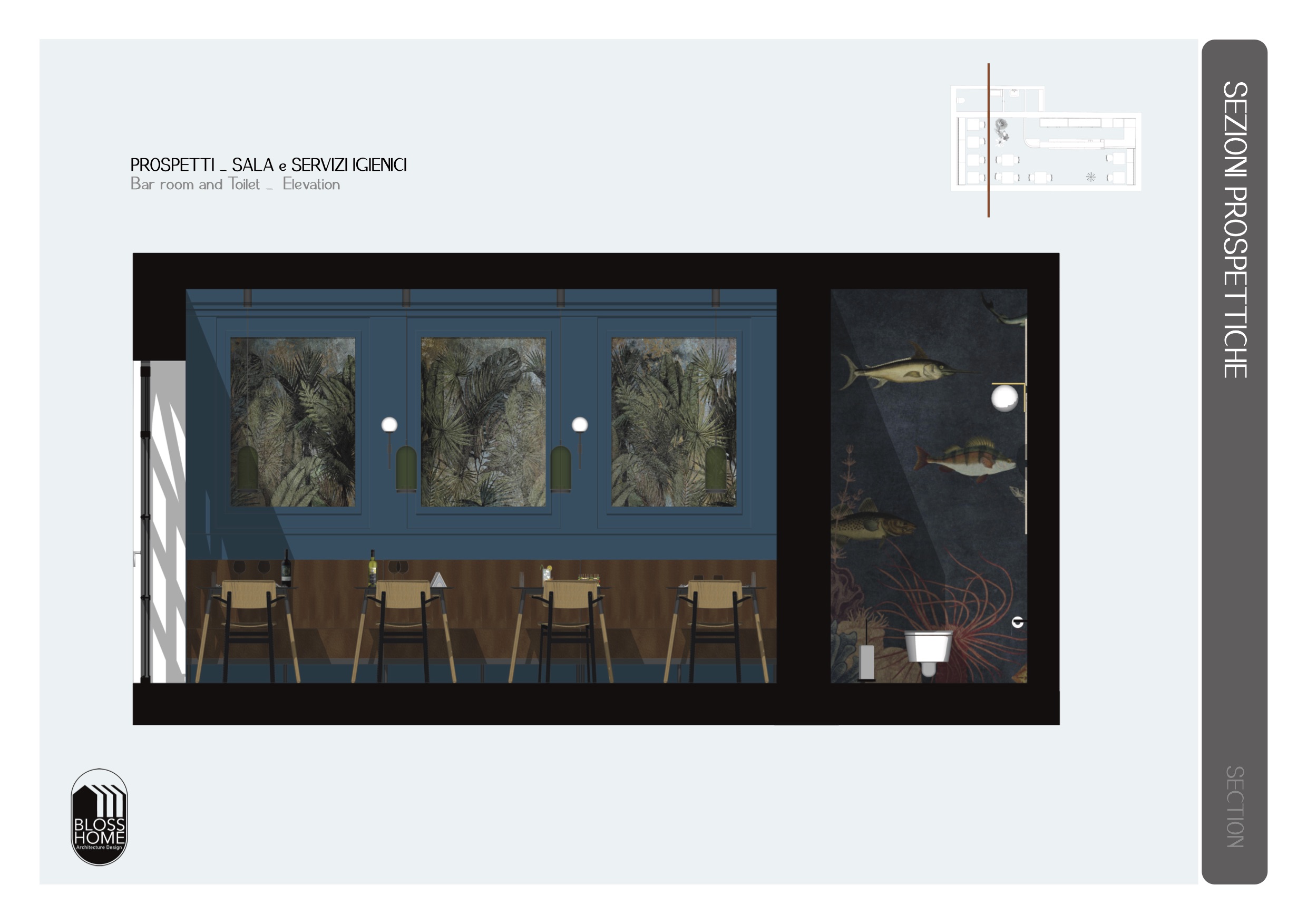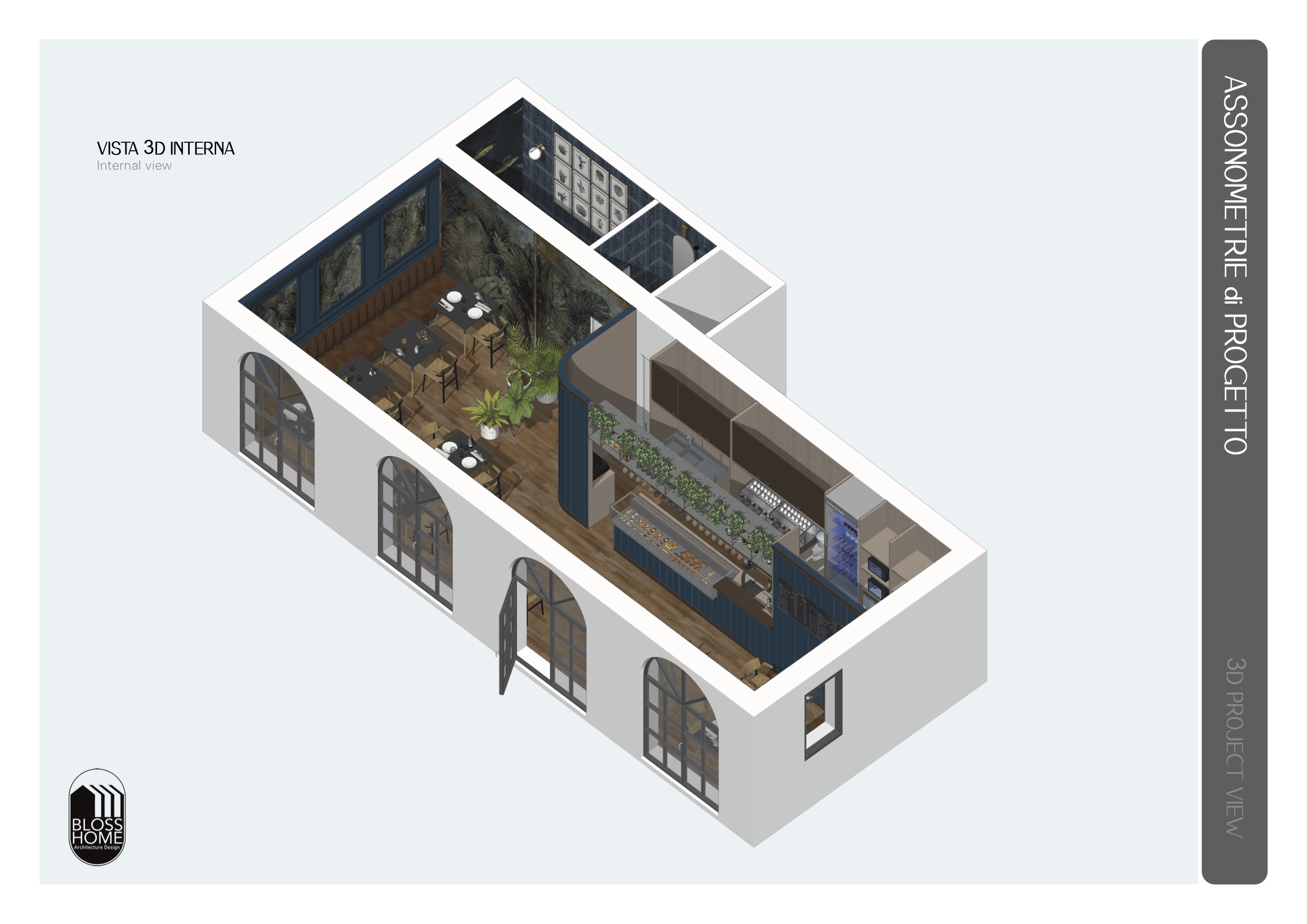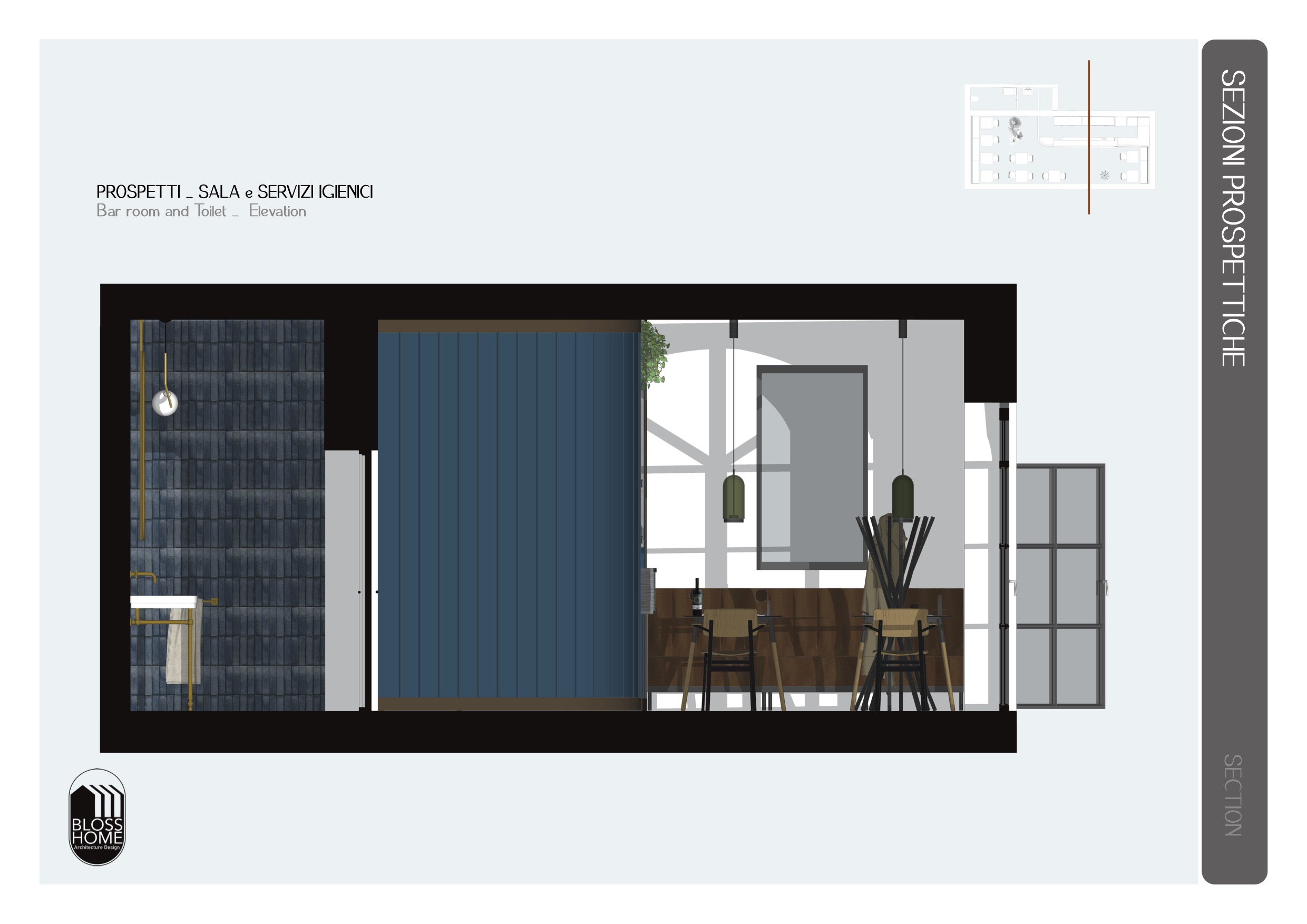 Il locale progettato è di circa 150mq e si sviluppa longitudinalmente. Il bancone attrezzato è collegato con l’area di preparazione, la sala con le sue diverse tipologie di seduta ed i materiali caldi, risulta conviviale ed avvolgente. I materiali selezionati richiamano i toni scuri per caratterizzare in stile simil inglese il locale.