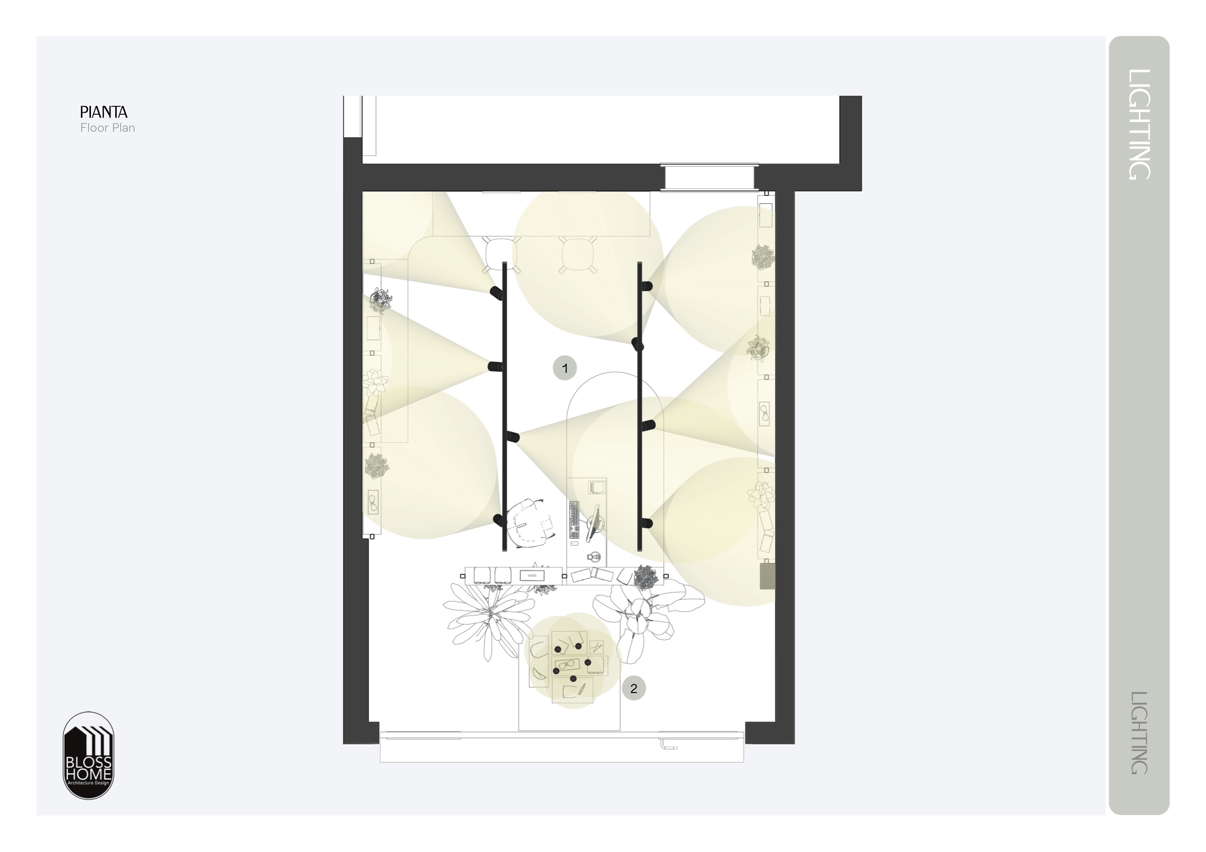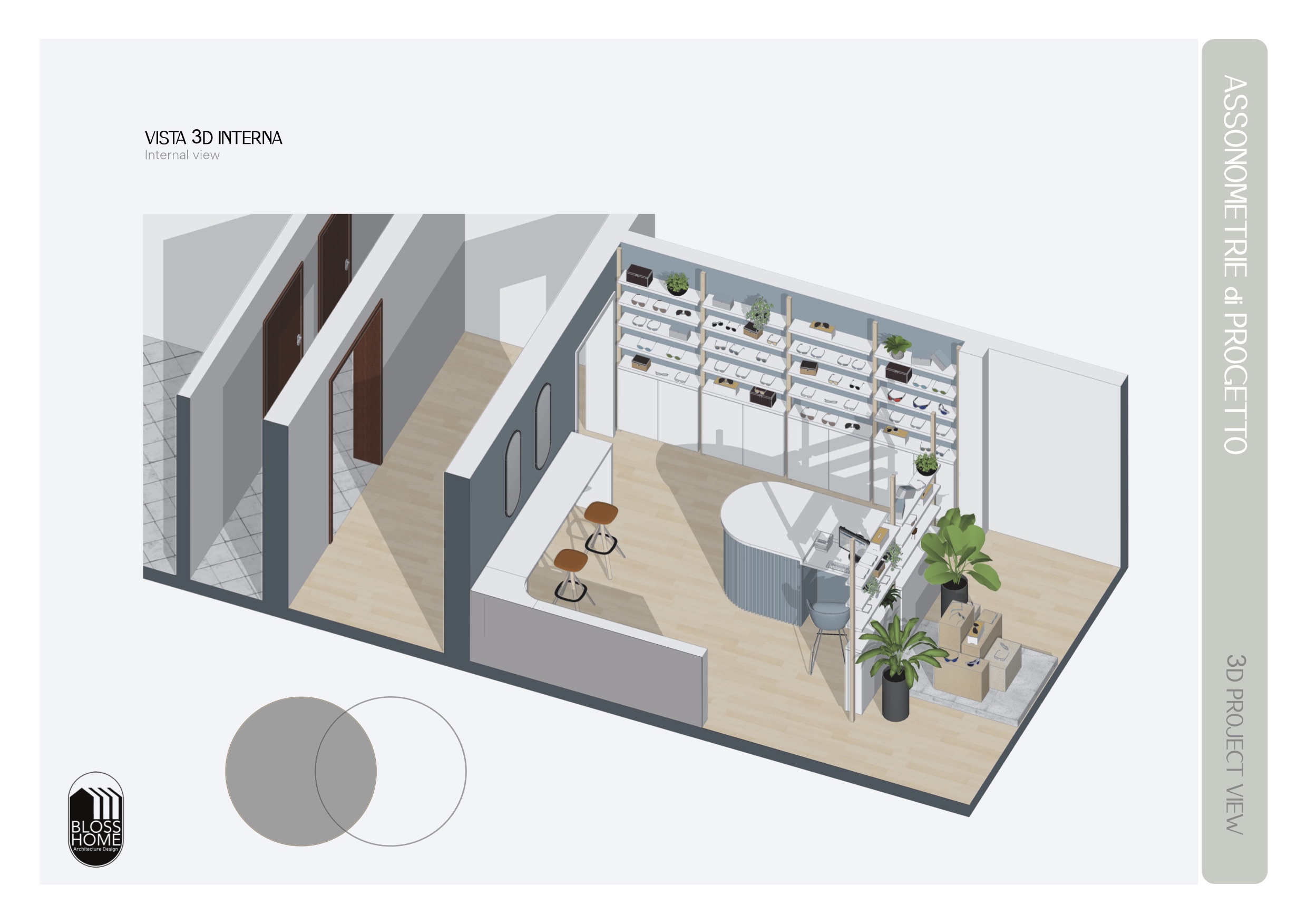 Il progetto aveva come focus uno spazio dedicato alla vendita di occhiali di circa 30mq. L’immobile presenta 2 ingressi che hanno permesso di sviluppare un flusso interno che gira attorno ad un bancone su misura curvilineo. Pedane, totem e mensole espositive sono gli elementi pensati per creare un ambiente ordinato e dal design fresco, efficace inoltre per enfatizzare i prodotti.